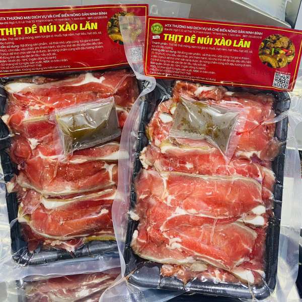Thịt Dê Xào Lăn được làm từ thịt dê núi Ninh Bình thái mỏng, săn ngọt tự nhiên. Sản phẩm đi kèm gói gia vị gồm sả, riềng, hạt dổi, hạt tiêu… tạo mùi thơm đặc trưng của món xào lăn. Chỉ cần rã đông, ướp 5 phút và xào 2–3 phút là có ngay món dê thơm cay, đậm vị.